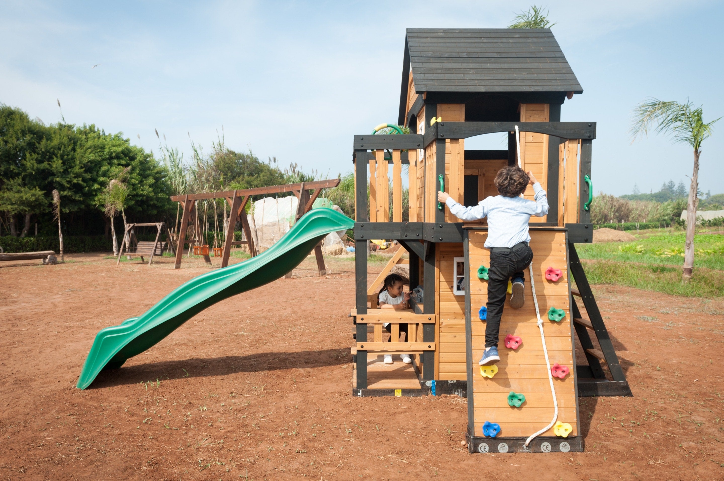 Toboggan, bac à sable gigantesque, balançoire, cabane...